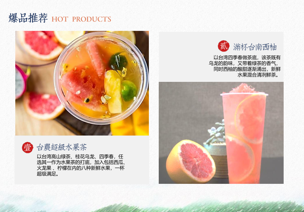 知茶方制茶,呈茶香亦求新生。臺灣高山族茶——茶浪嘿忠于中國傳統(tǒng)茶道,專注呈現(xiàn)高山茶香,回歸茶葉原本的味道,甄選最優(yōu)質(zhì)的茶葉,采用最精湛的制茶技藝,打造最醇美原生好茶。在此基礎(chǔ)上融入四季果茶、冷泡茶、奶蓋茶等年輕女性喜愛的流行元素,以濃郁香醇口感+健康美味、有顏有料食材+富有時尚品味的品牌形象,打造茶飲新風(fēng)尚,深得大眾喜歡。