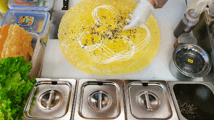 集顏值、營養(yǎng)與口味于一身,噴香的餅皮上刷上獨門秘制醬料